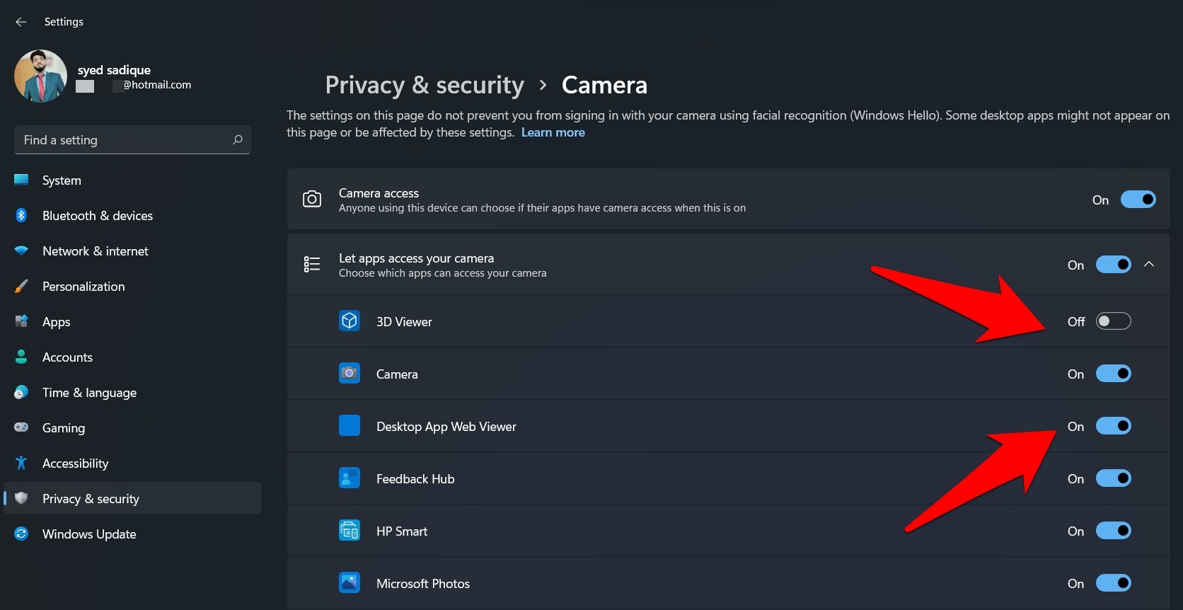 - 现在启用/禁用相机访问切换以打开或关闭 Windows 11 PC 上的系统范围的网络摄像头访问。