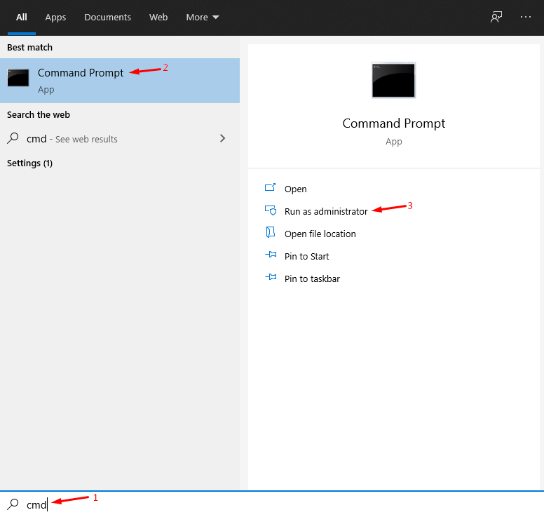 - 通过键入 cmd 从搜索框中打开命令提示符