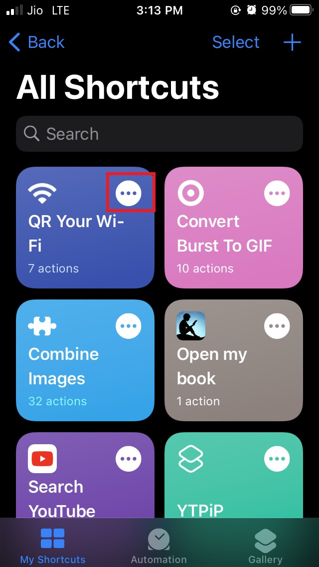 - 点击QR 你的 WiFi 选项卡中的三点按钮。它会将您重定向到快捷方式应该执行的操作列表。