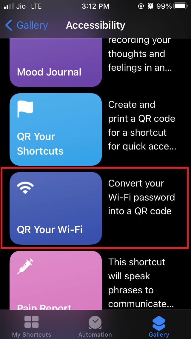 - 转到“我的快捷方式”部分,您应该会看到其中列出的 QR 您的 WiFi