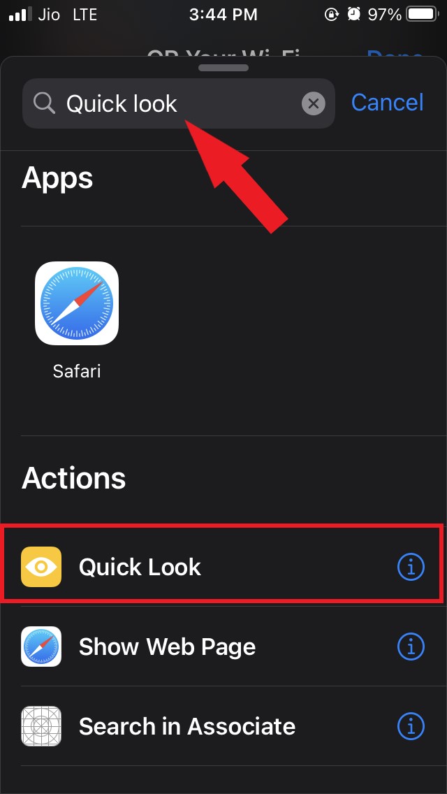 - 在搜索结果中看到Quick Look后,点击 Quick Look,将其与 Qr Your WiFi 快捷方式集成。