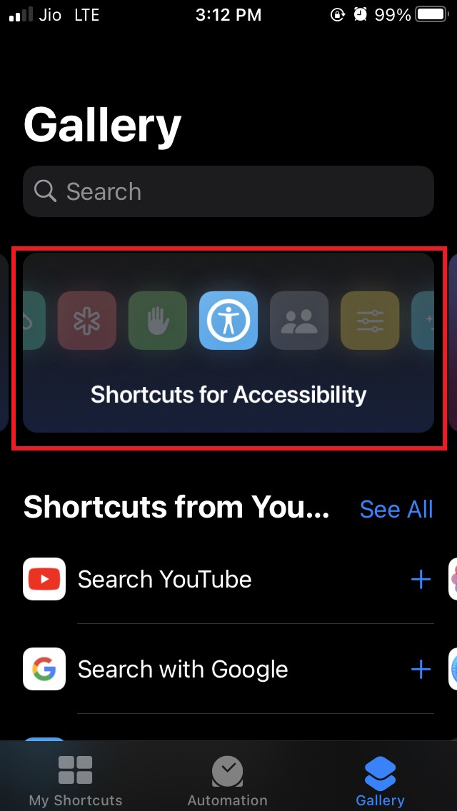 - 接下来,您可以在水平横幅上向左滚动,直到看到“辅助功能的快捷方式”选项。点击它。