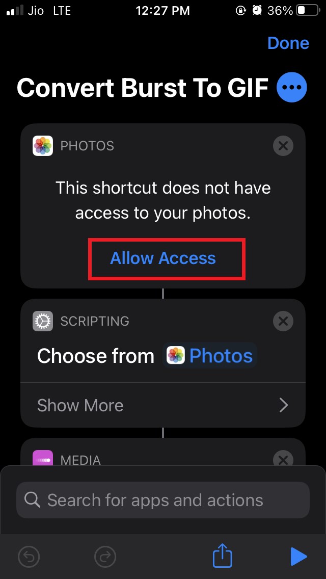 - 此时,您必须允许 iPhone 上的照片应用程序允许访问新的快捷方式。[默认情况下,自定义快捷方式在用户授予之前无权访问任何应用程序。]