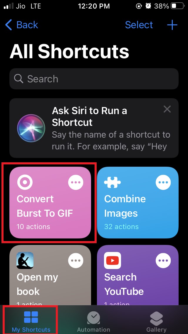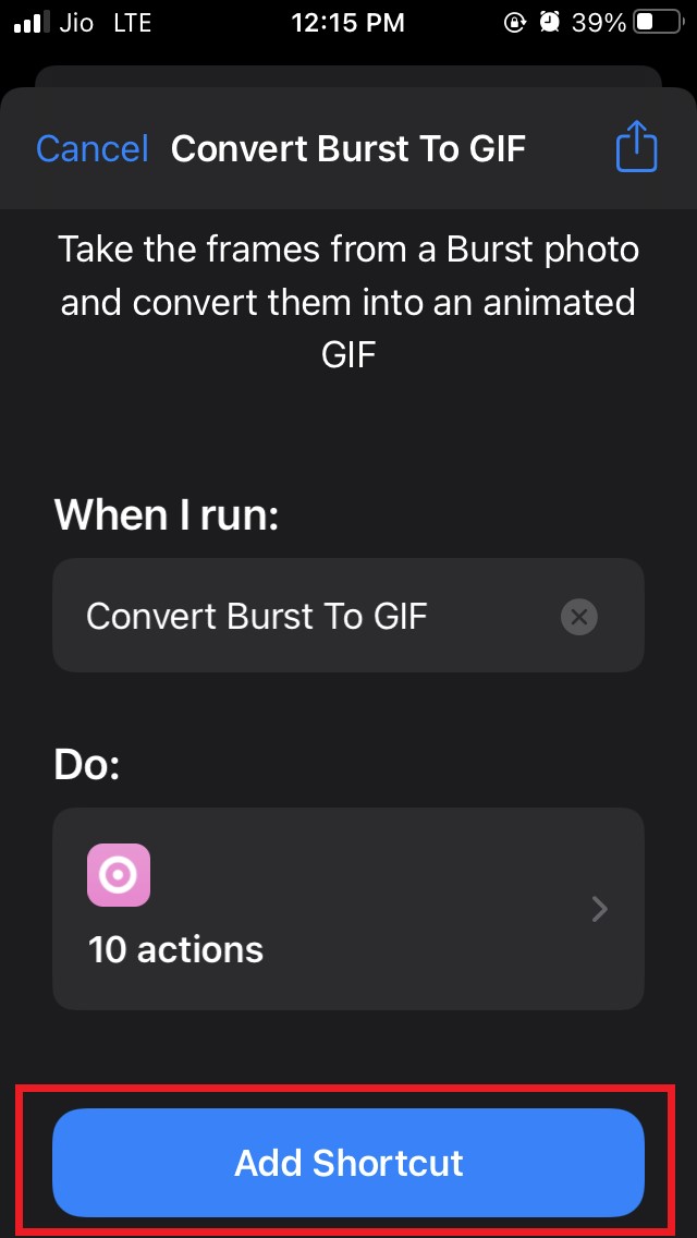 该快捷方式的应用已经来到你的iPhone上预装。我已经提到了从使用连拍模式在 iPhone 上拍摄的图像中创建 GIF 图像所需遵循的所有步骤。