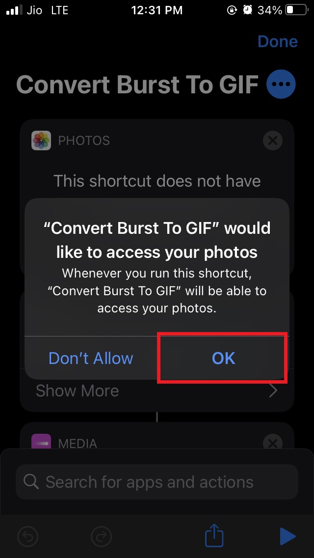 - 将出现一个小弹出框,其中提到每当您运行 Burst to GIF 快捷方式时,它将自动访问照片应用程序。