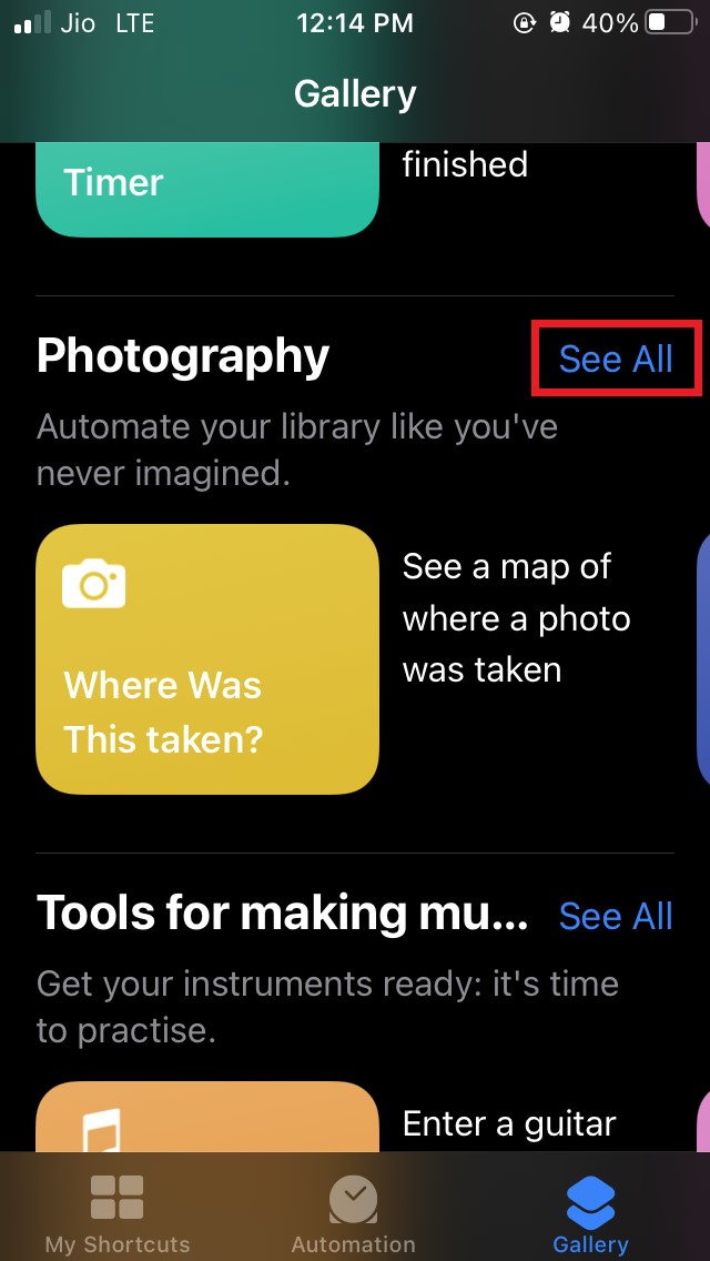 - 点击“查看全部”选项,您会在“摄影”选项卡之外找到该选项。