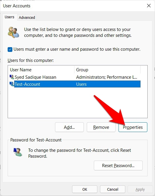 - 它将打开用户帐户窗口。从那里选择您的个人资料,然后单击“属性”按钮。