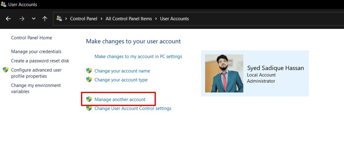 - 然后转到“用户帐户”部分并单击“管理另一个帐户”。