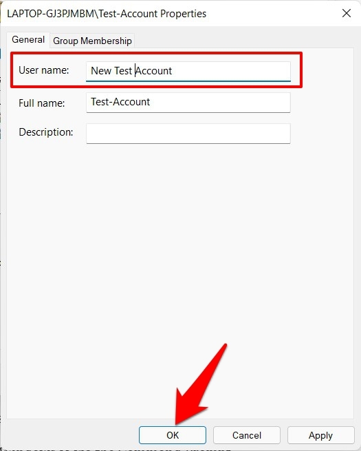- 现在转到User name字段,输入新名称,然后点击OK。名称的更改将立即反映出来。