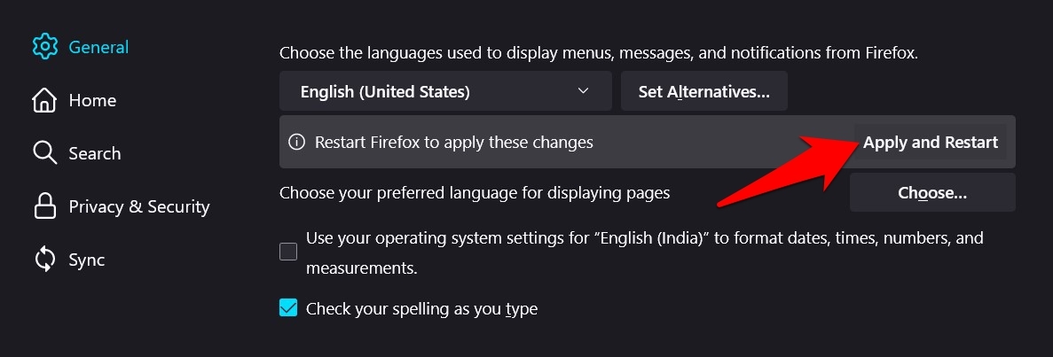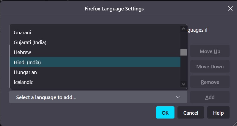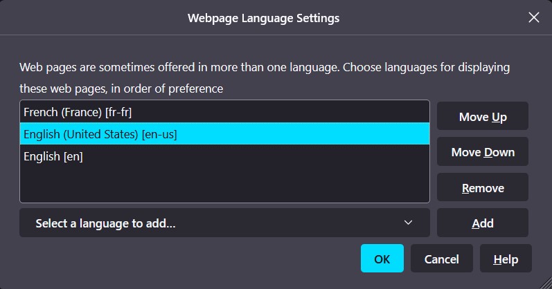 Firefox 会将第一种语言视为默认语言,并在需要时使用第二种和第三种语言。因此,如果您想更改他们的位置,请选择所需的语言并使用 要么 按钮执行上述操作。