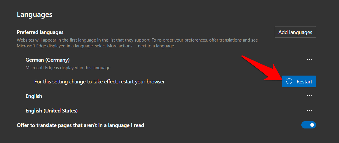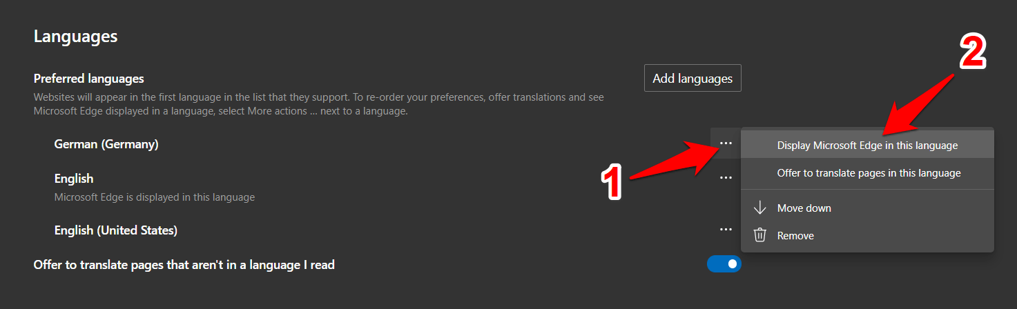 浏览器将按照相同的方式以英语显示其所有功能/菜单。如果您想更改此设置,请单击所需语言旁边的三个水平点,然后选择以这种语言显示 Microsoft Edge。