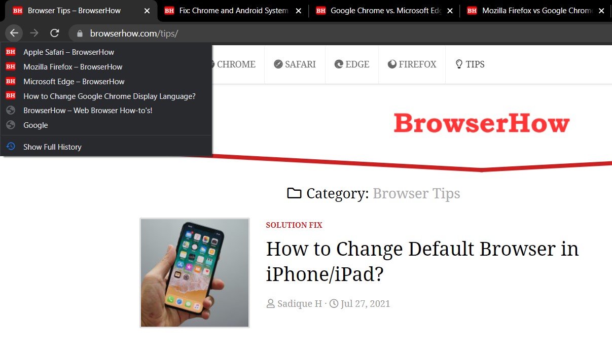 好吧,您需要做的就是长按浏览器的后退箭头按钮(大约 3-4 秒)。