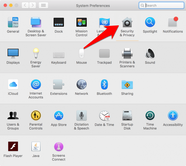 它将打开“系统偏好设置”窗口。 - 单击以打开“安全和隐私”首选项。