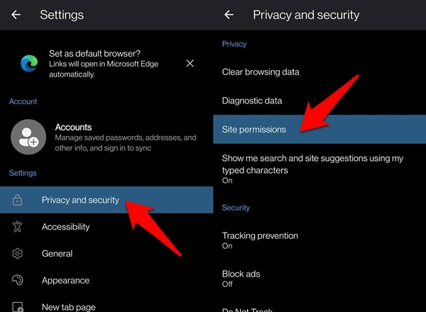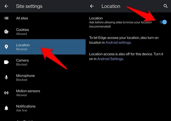 与 Edge 计算机一样,适用于 Android 的 Microsoft Edge 提供对浏览器和站点使用位置服务的完全控制。我们可以阻止单个请求或完全停止获取设备位置请求。