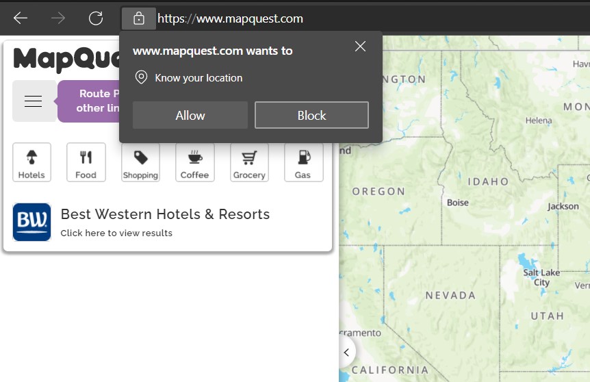 计算机上的 Edge 浏览器允许控制位置服务并请求允许或阻止站点访问您的位置的权限。