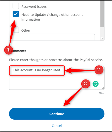 接下来,系统会询问您为什么要删除您的帐户。通过单击选中任何相关框,在文本框中键入您想留下的任何评论,然后单击“继续”。