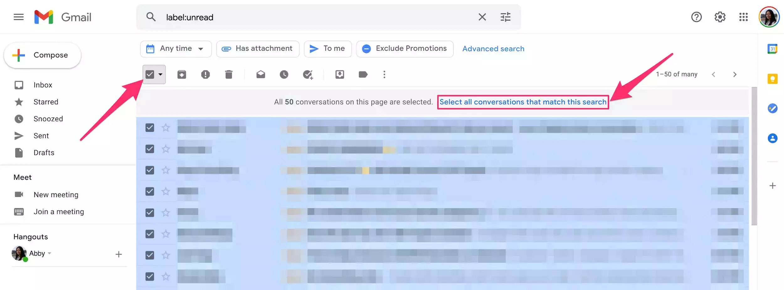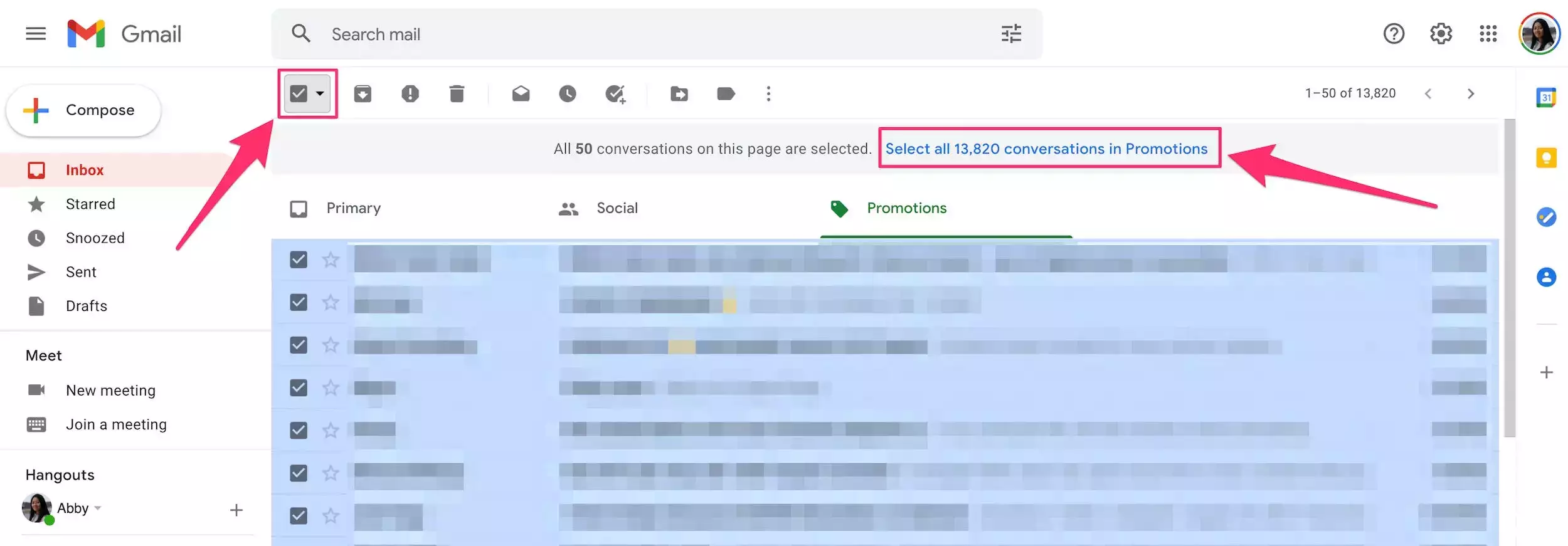 3.单击选择所有框左边的刷新按钮。这将选择当前页面上的所有电子邮件(50 封电子邮件)。要批量删除此类别中的所有电子邮件(不仅仅是第一页上的电子邮件),还请单击选择与此搜索匹配的所有对话。