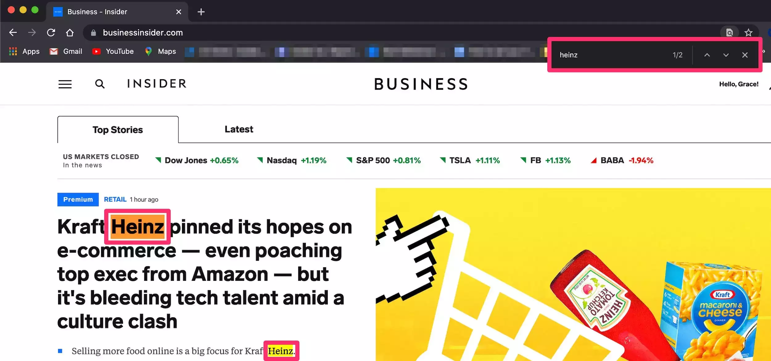 然后会在屏幕顶部出现一个文本框,您可以在其中输入所需的搜索词。然后,只需按 Enter即可在页面上查找该单词或短语的实例。您可以使用搜索框中的向上和向下箭头来查找每个实例。