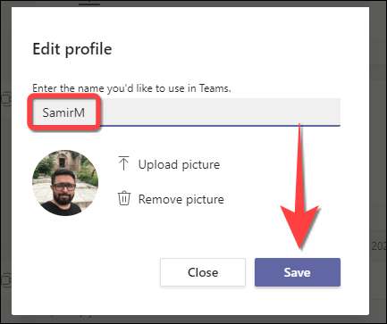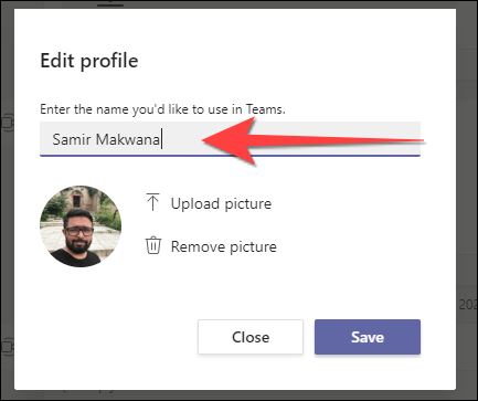 “编辑配置文件”窗口将打开。在“输入您想在团队中使用的名称”下方显示的框中键入一个新名称。