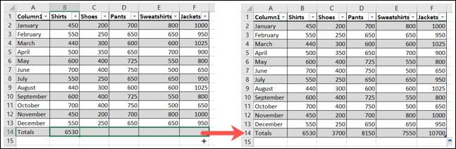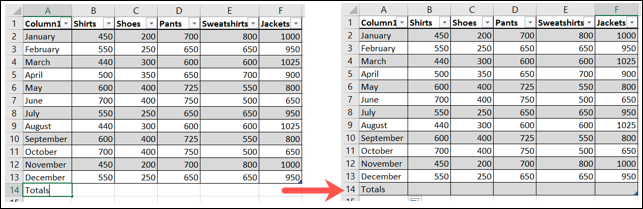 您可以 通过转到第一列中的最后一个单元格并键入来快速向表格底部添加一行。例如,您可以输入单词 Totals 并按 Enter,这会自动创建一个新的表格行。