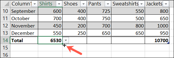 然后,选择单元格并将光标放在右下角以显示填充手柄(加号)。拖动到该总计行中的剩余单元格以复制公式。