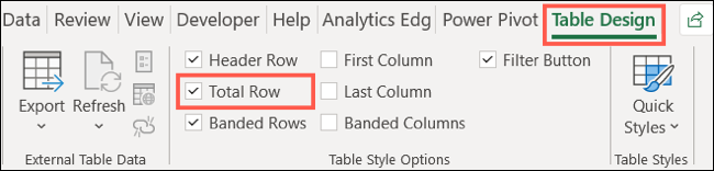 选择表格中的任何单元格,然后转到显示的“表格设计”选项卡。在功能区的“表格样式选项”部分,选中“总行”框。