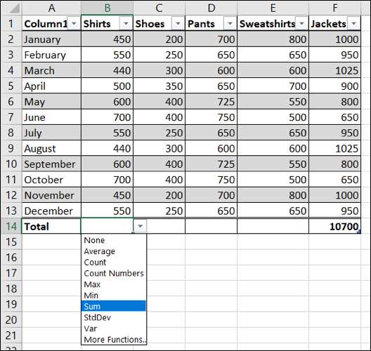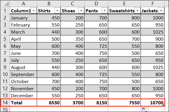 幸运的是,此键盘快捷键的工作方式与上面“表格设计”选项卡上的“总计行”复选框相同,因此您可以按照相同的步骤插入剩余的总计并将公式复制到总计行中的其他单元格。