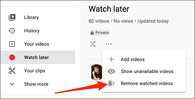 您可以在网站右侧看到您的“稍后观看”视频。在此页面上,在“稍后观看”标题下方,单击三个点。