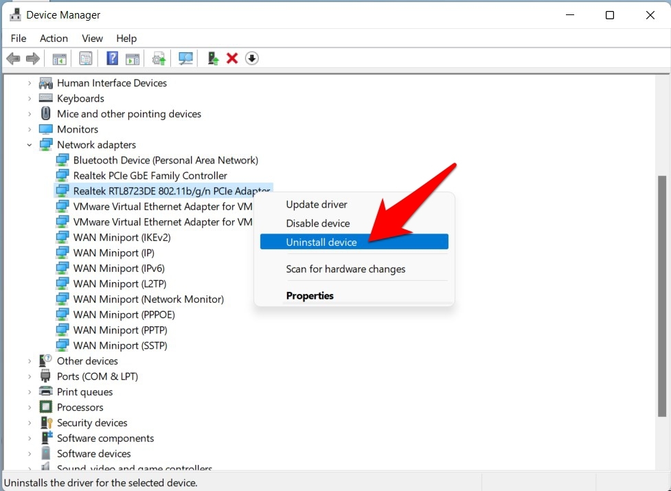 - 右键单击您的网络驱动程序并选择Uninstall Device。