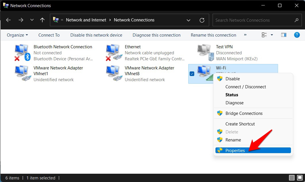 - 之后,右键单击您当前连接的网络并选择Properties。