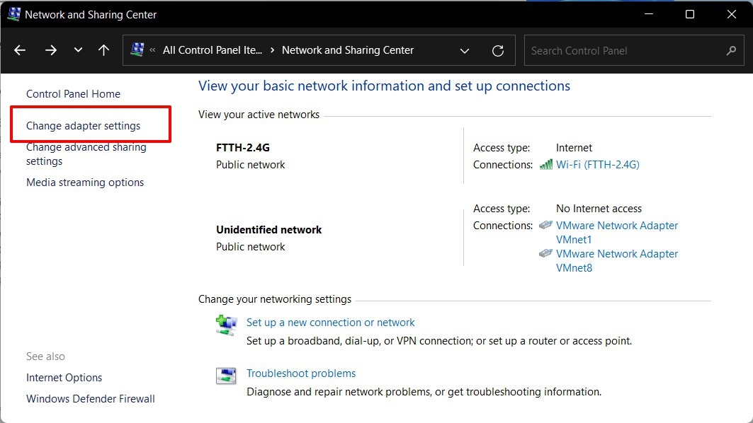- 然后选择网络和共享中心,然后单击左侧菜单栏中的更改适配器设置。