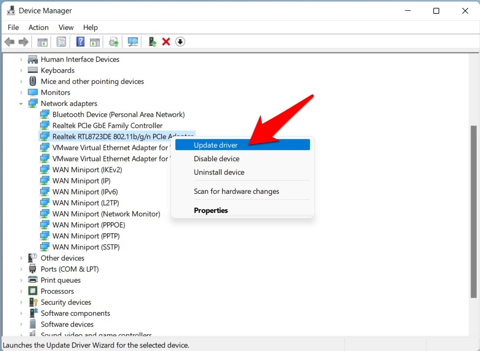 - 现在右键单击您的 WiFi 驱动程序(具有 802.11 b/g/n 或 a/c 关键字)并选择更新驱动程序。