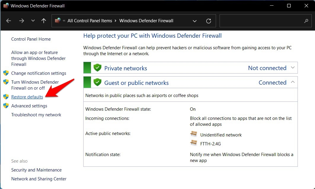 如果您为 Windows 防火墙创建了任何限制性规则,后者可能会变得过度保护并最终阻止大多数连接。因此,您可以禁用防火墙或将其设置重置为默认值;由于禁用它可能不会被证明是一个安全的赌注,因此,让我们继续执行重置它的步骤。