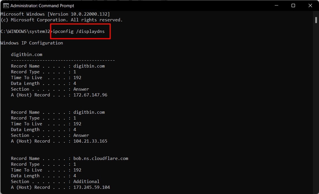 有了这个,我们完善了有关如何在 Windows 11 中刷新 DNS 缓存的指南。如果在任何时候,您希望获得当前存储的 DNS 缓存,那么您只需执行 ipconfig 即可轻松实现CMD窗口中的/displaydns命令,如下图: