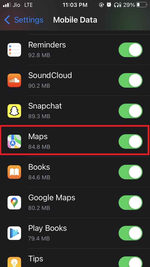 - 滚动到地图并检查是否为其启用了蜂窝数据