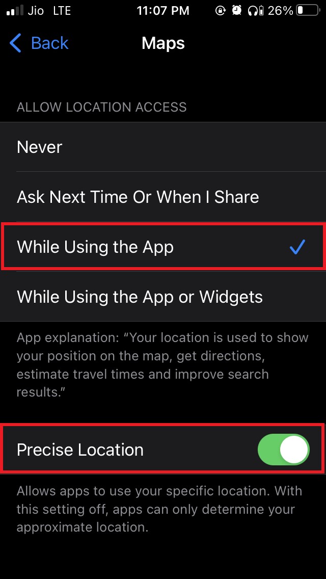 确保 Apple 地图可以指出您在某个地区的确切位置。这可以通过在 iOS 设置下启用精确定位选项和定位服务功能来实现。
