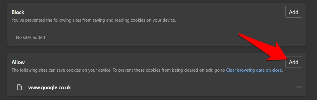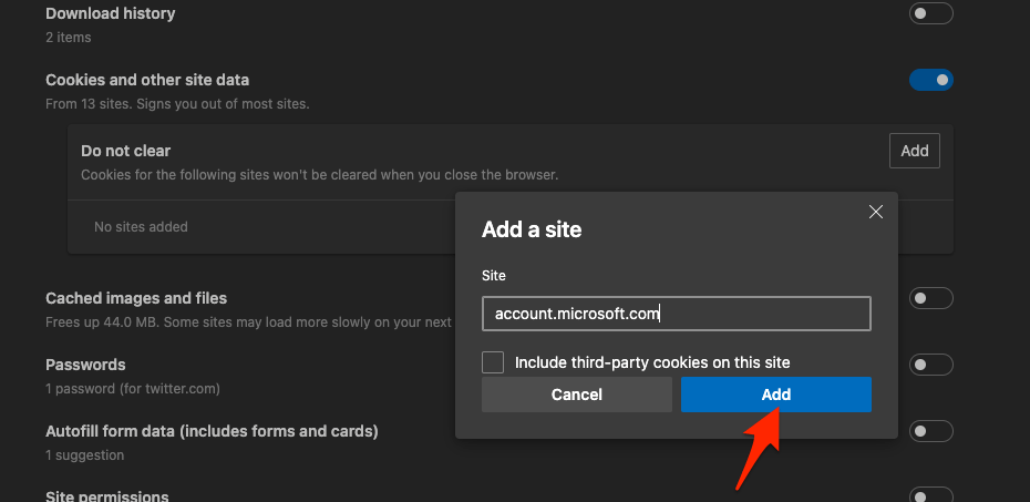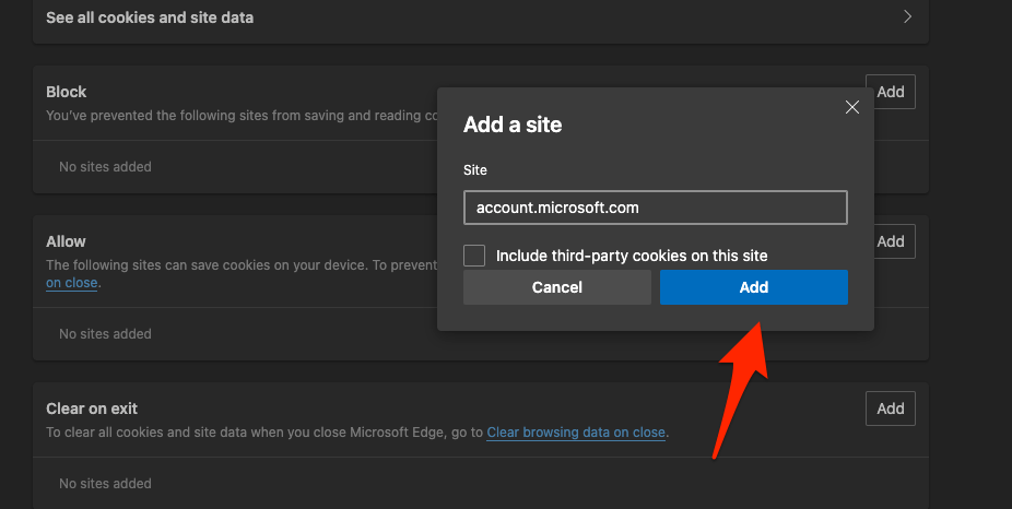 以下是将 Microsoft 服务帐户列入白名单以在 Edge 上存储 cookie 的步骤: