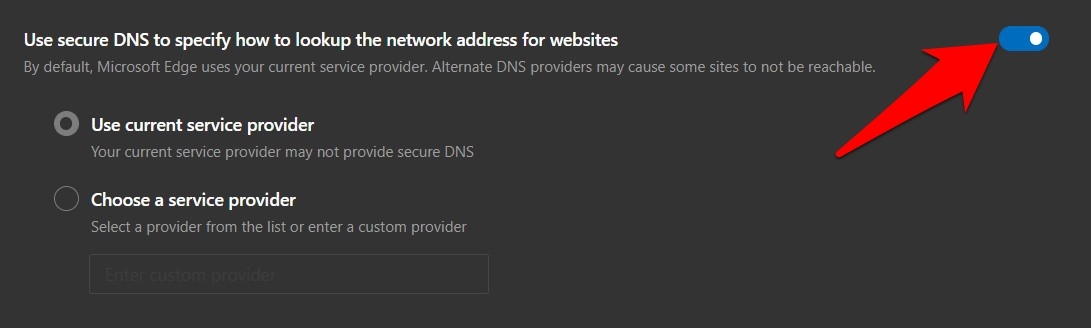 - 向下滚动到安全部分并禁用使用安全 DNS切换。