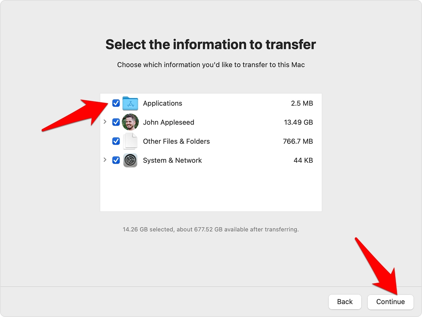 - 选择要传输的信息对话框下的应用程序复选框,然后点击 按钮。
