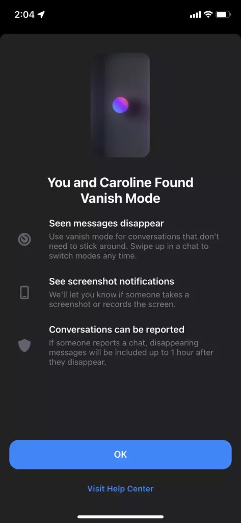 3.您当前的聊天将消失,取而代之的是一个空的消失模式屏幕。如果这是您第一次激活该功能,您还会看到一个弹出窗口,其中包含有关消失模式的一些信息。