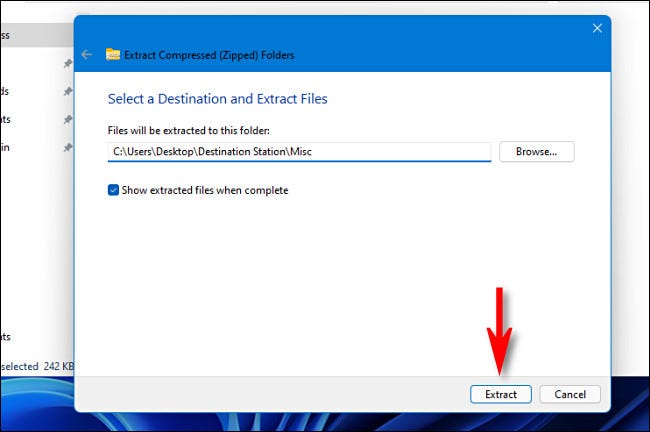 如果您想在进程完成后在文件资源管理器中查看提取的文件,请选中“完成时显示提取的文件”旁边的框。完成这些选项后,单击“提取”。