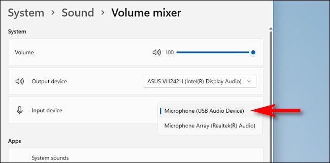 Windows 设置将打开系统 > 声音 > 音量混合器页面。在“输入设备”下,单击下拉菜单并从列表中选择要使用的麦克风。