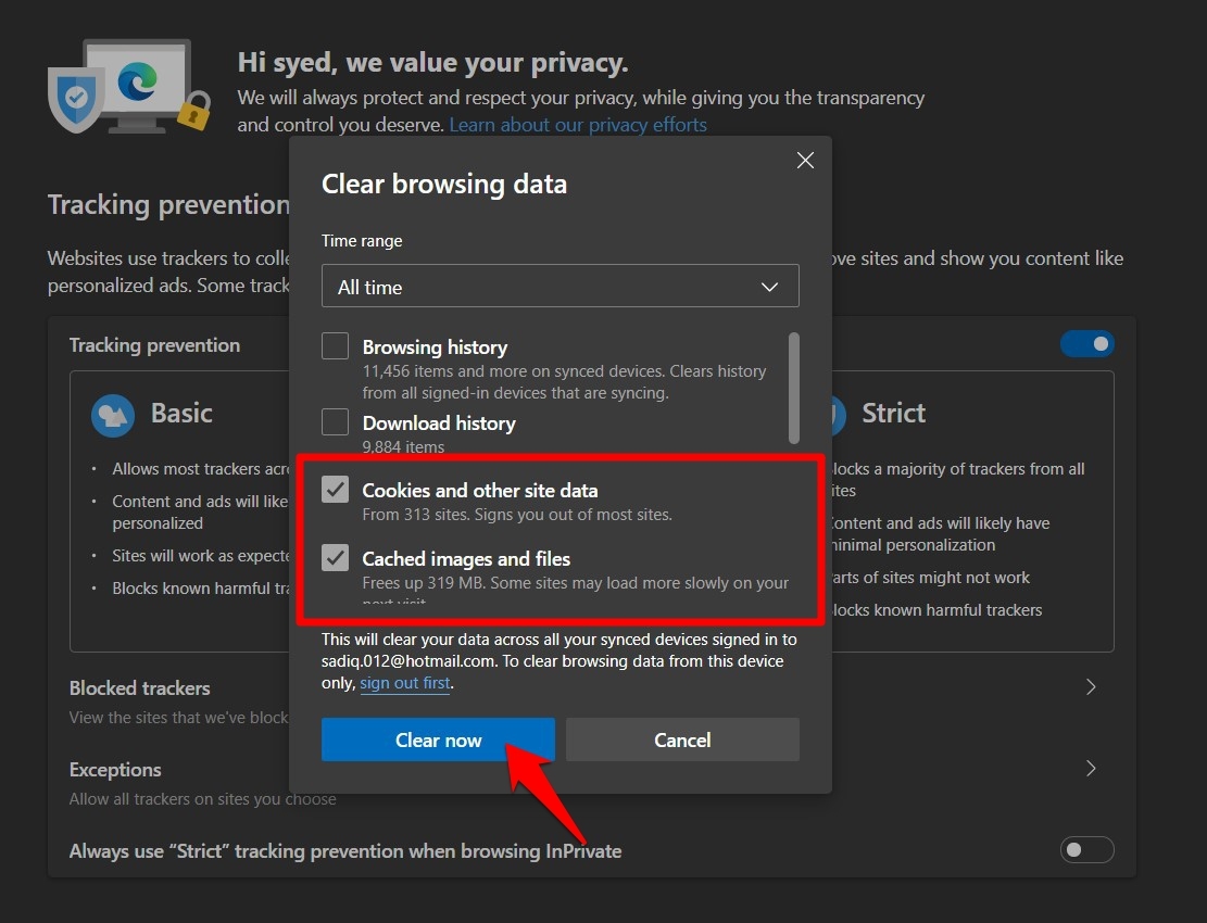它将打开清除浏览数据对话框。 - 选择Cookie 和其他站点数据以及缓存的图像和文件复选框。