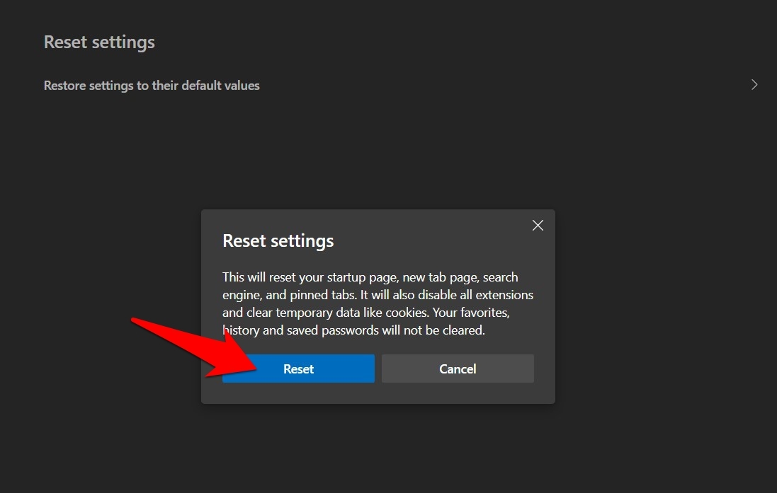 重置浏览器将使 Edge 恢复到出厂默认状态。它还将删除启动页面和默认搜索引擎,并将清除临时数据。