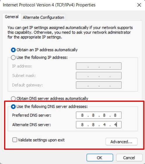 在某些情况下,您的 ISP 提供的默认域名服务器可能无法成功建立在线连接。因此,如果您随后考虑切换到 Google 或 Cloudflare 的 DNS,那将会有所帮助。