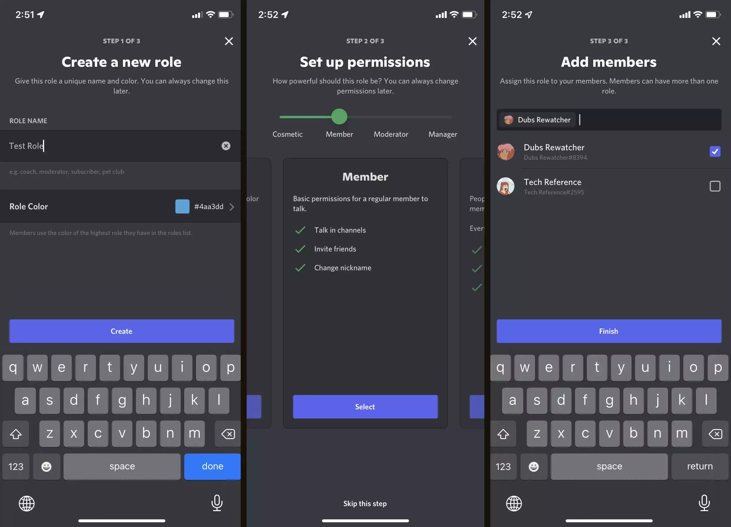 - 在 iPhone 上,为角色指定名称和颜色,然后轻点“创建”。在下一页上,选择一种预设权限类型 – 越向右,角色将拥有的权限越多 – 或选择跳过此步骤以创建没有权限的角色。最后,选择要立即赋予角色的服务器成员,然后选择Finish。