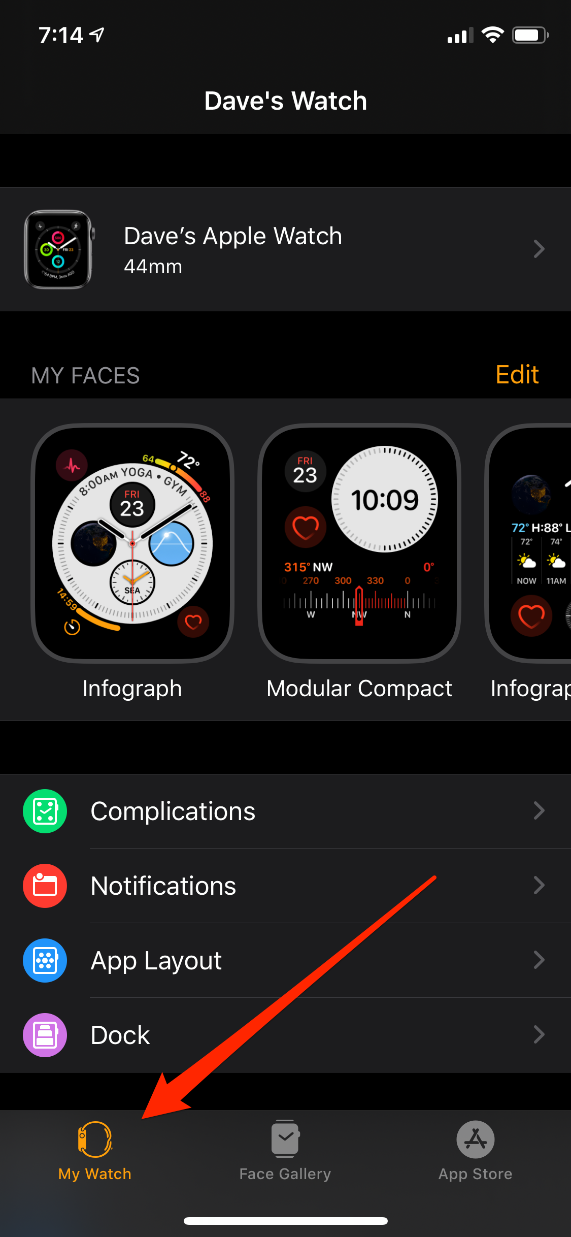 确保您在Apple Watch应用程序的“我的手表”选项卡上。