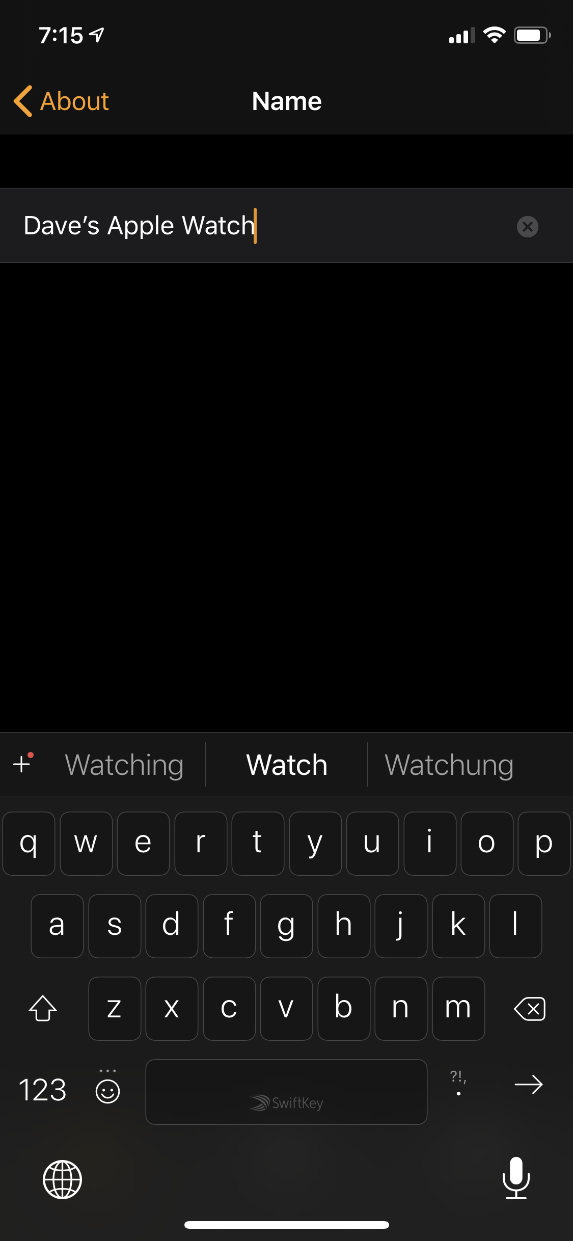 6.现在,您可以将名称更改为任何您喜欢的名称。完成后,您可以点击键盘上的Enter键或点击“关于”返回上一页。您的手表将自动更新为新名称。