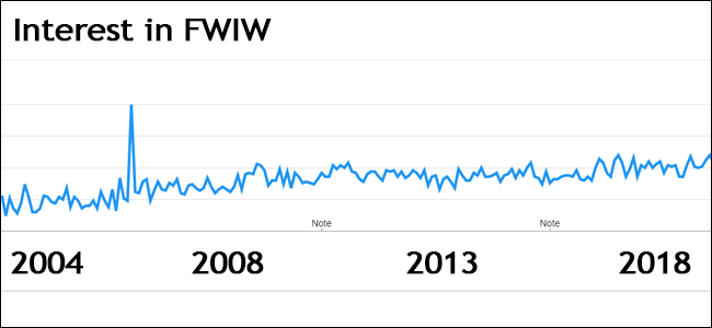 这种缩短可能发生在互联网的早期。有证据表明,FWIW 在 80 年代后期在 Usenet 上很流行,或者至少流行到从 1989 年 7 月开始就出现在“详尽”的互联网渣渣和表情符号列表中。据报道,至少从 2004 年开始,这个词的使用率就慢慢上升了。谷歌趋势,虽然它从未见过像“ NSFW ”或“ TFW ”这样的首字母缩写词的流行。