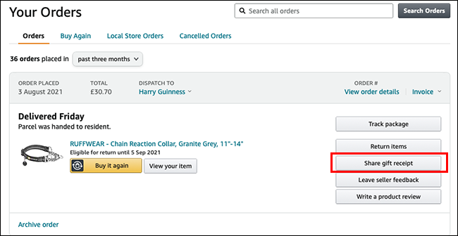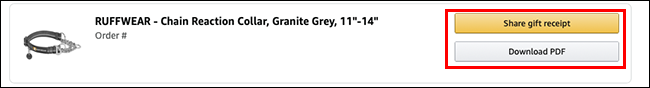 找到您想要收到礼品收据的订单,然后单击“分享礼品收据”。